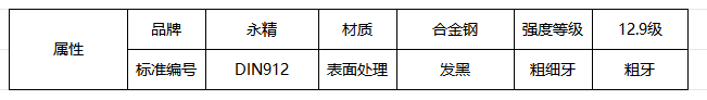 本产品为符合DIN912标准的内六角圆柱头螺钉,性能等级达到12.9级,采用高强度合金钢材料制造,表面进行发黑处理。该螺钉具有高的抗拉强度和抗疲劳性能,内六角驱动设计允许更大的拧紧扭矩并节省安装空间。
